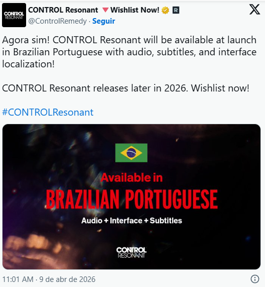 A informação foi divulgada pela própria Remedy ao revelar a lista oficial de idiomas do jogo. O anúncio acontece poucas semanas antes da participação da empresa na gamescom latam 2026, em São Paulo, onde Control: Resonant será um dos principais títulos apresentados ao público.