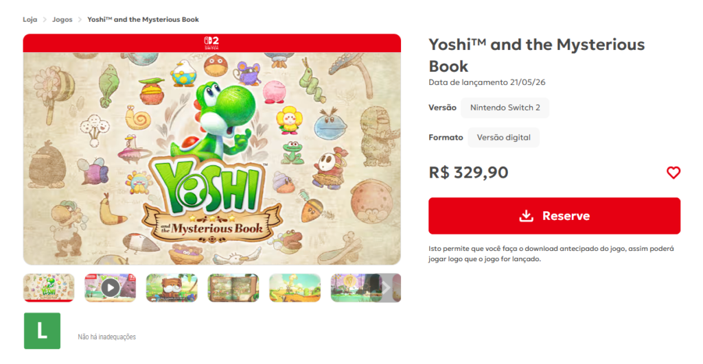 Na eShop brasileira, o novo título já aparece listado por R$ 329,90 na versão digital, abaixo do padrão anterior praticado em lançamentos da companhia, que girava em torno de R$ 349 a R$ 440.